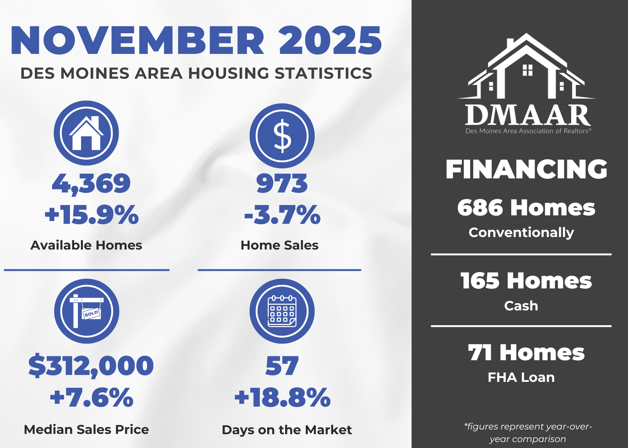 “As winter rears its head, many communities brace for a traditionally slower housing market, we’re not seeing that just yet in the metro,” Eric Webster, Des Moines Area Association of REALTORS® president, said. “The energetic market we witnessed this fall, buoyed by decreases in interest rates and seasonably warm weather, continues to fuel our early winter market. Buyers and sellers remain active and ready to work with their REALTOR® of choice to find their next home.”