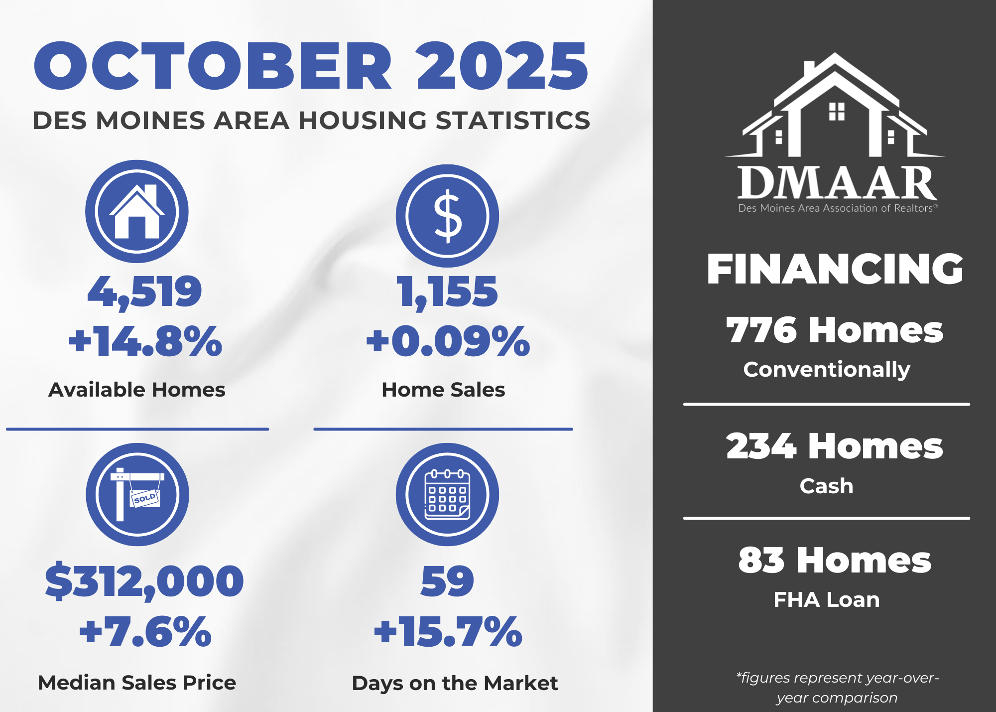 “The Des Moines metro continues to carry momentum as we head into fall,” said Eric Webster, President of the Des Moines Metro Area Association of REALTORS®. “Rising inventory and steady home sales provide opportunities for both buyers and sellers looking to jump into the fall market. Des Moines area REALTORS® are positioned to assist those looking for their next home.”